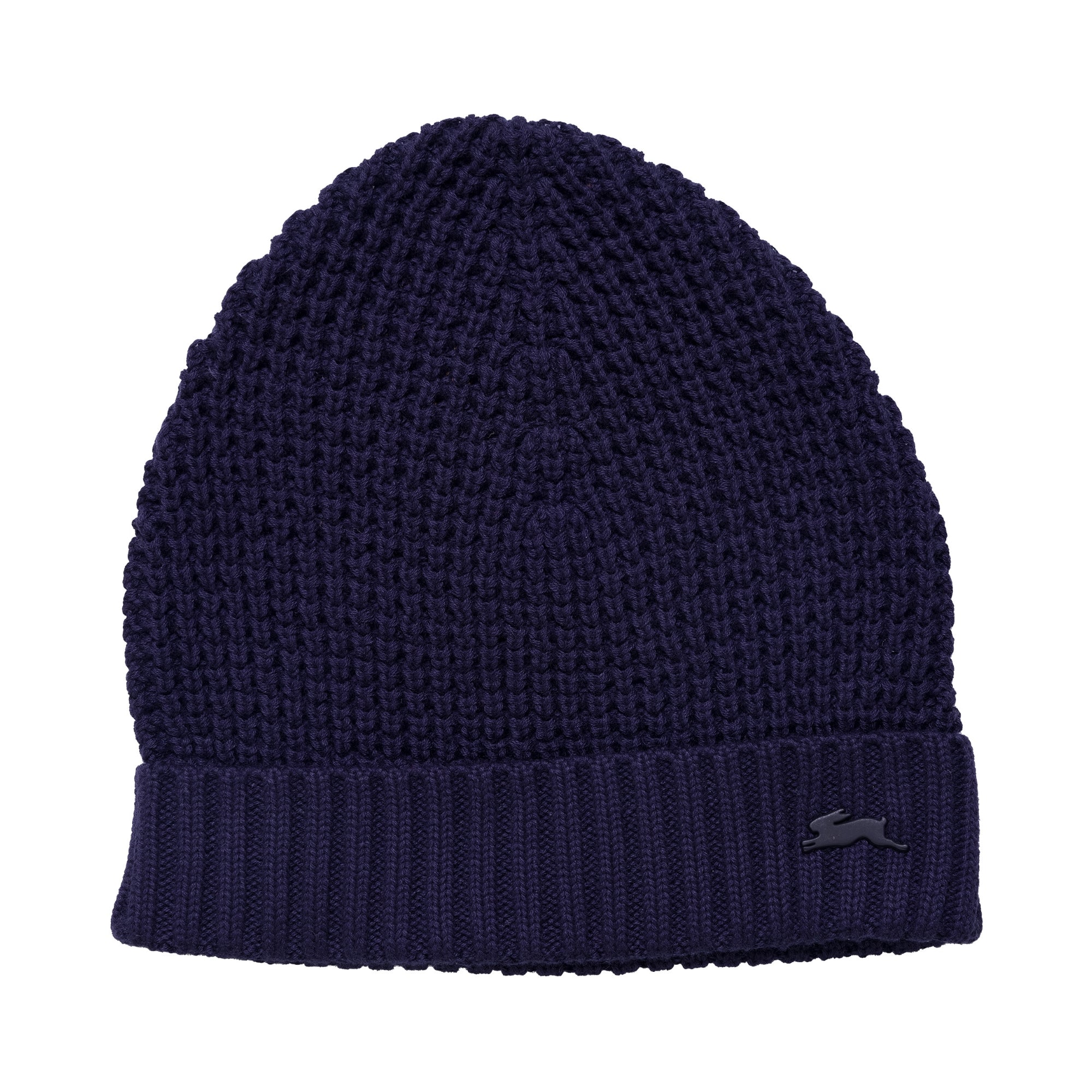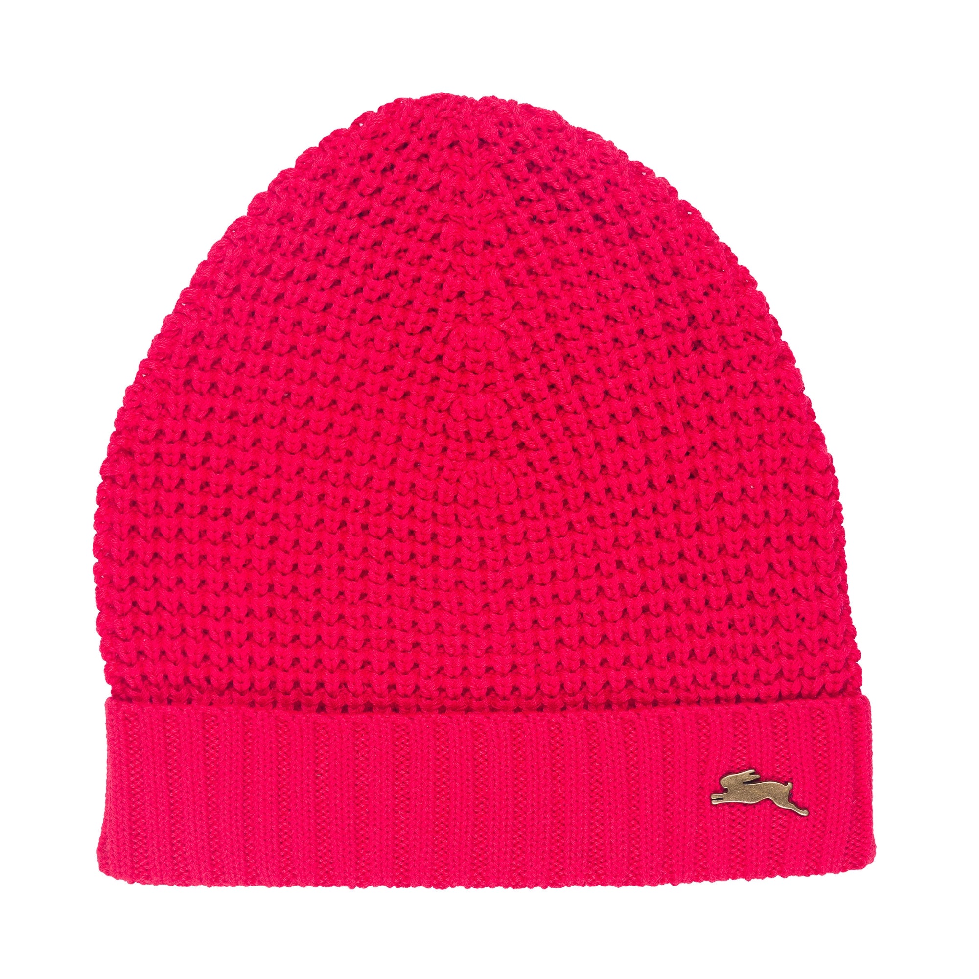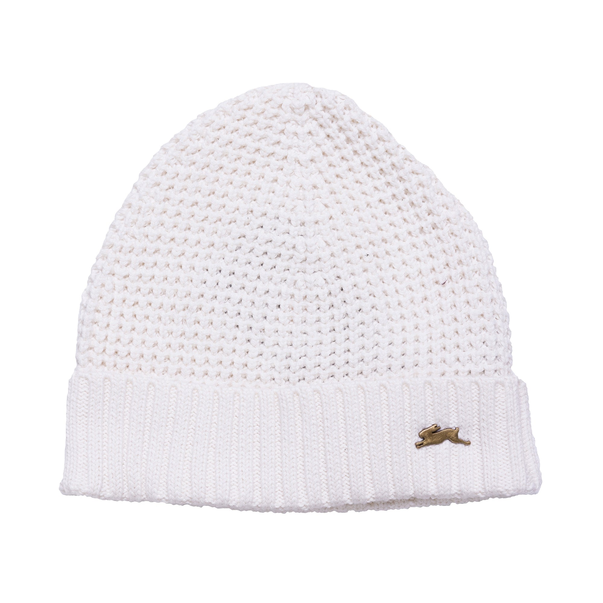 Popcorn sweater knit beanie with ribbing at the bottom edge of hat and our signature A.T rabbit pin placed at the front lower left edge of the ribbing.