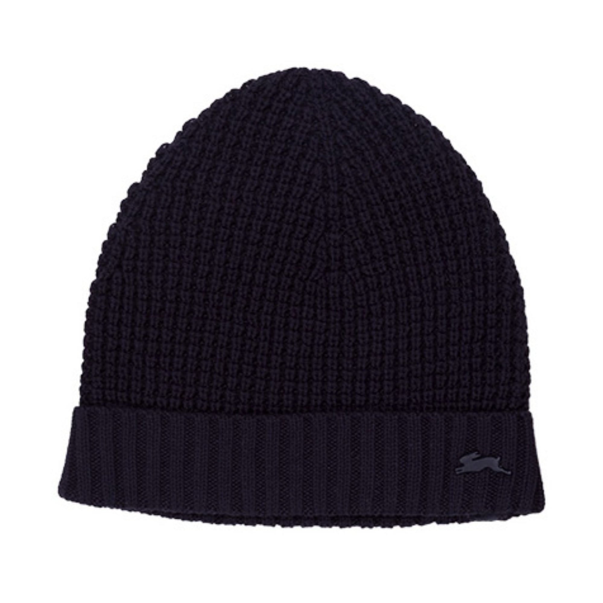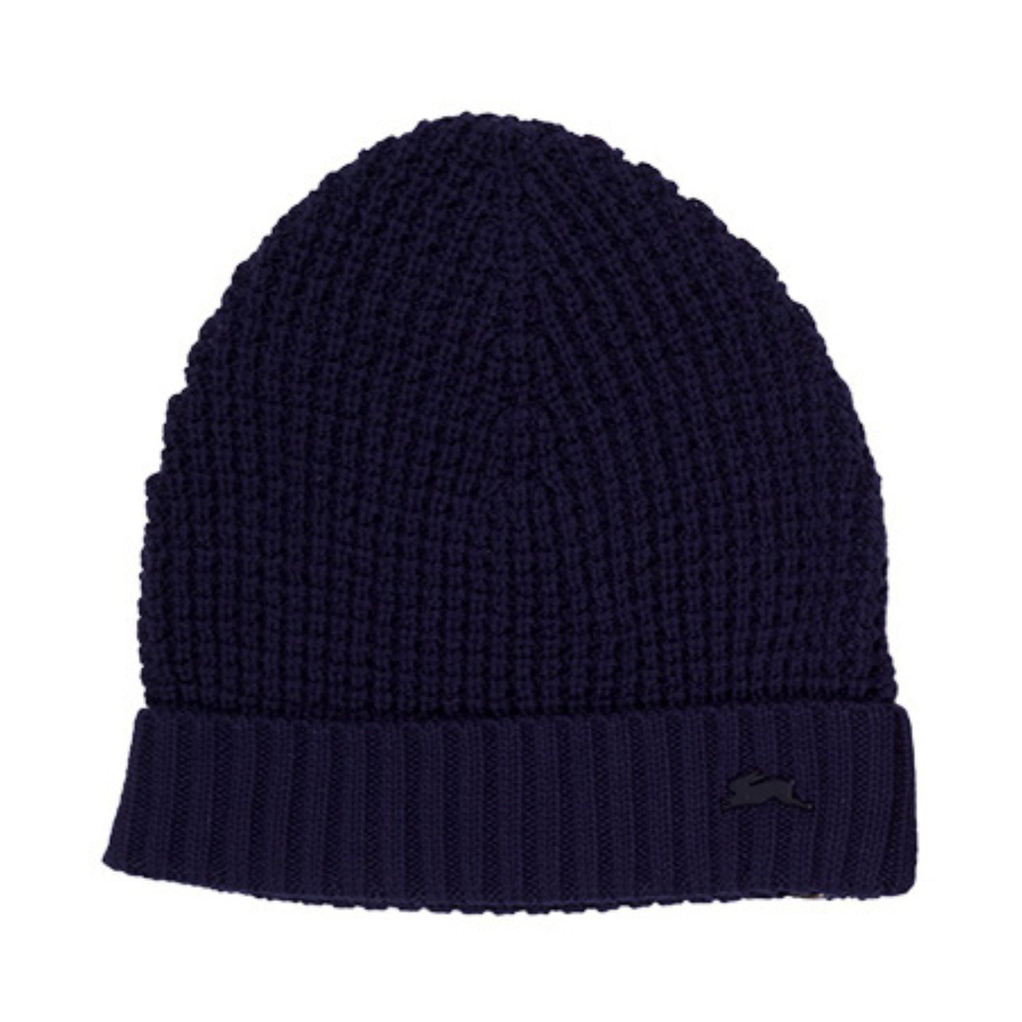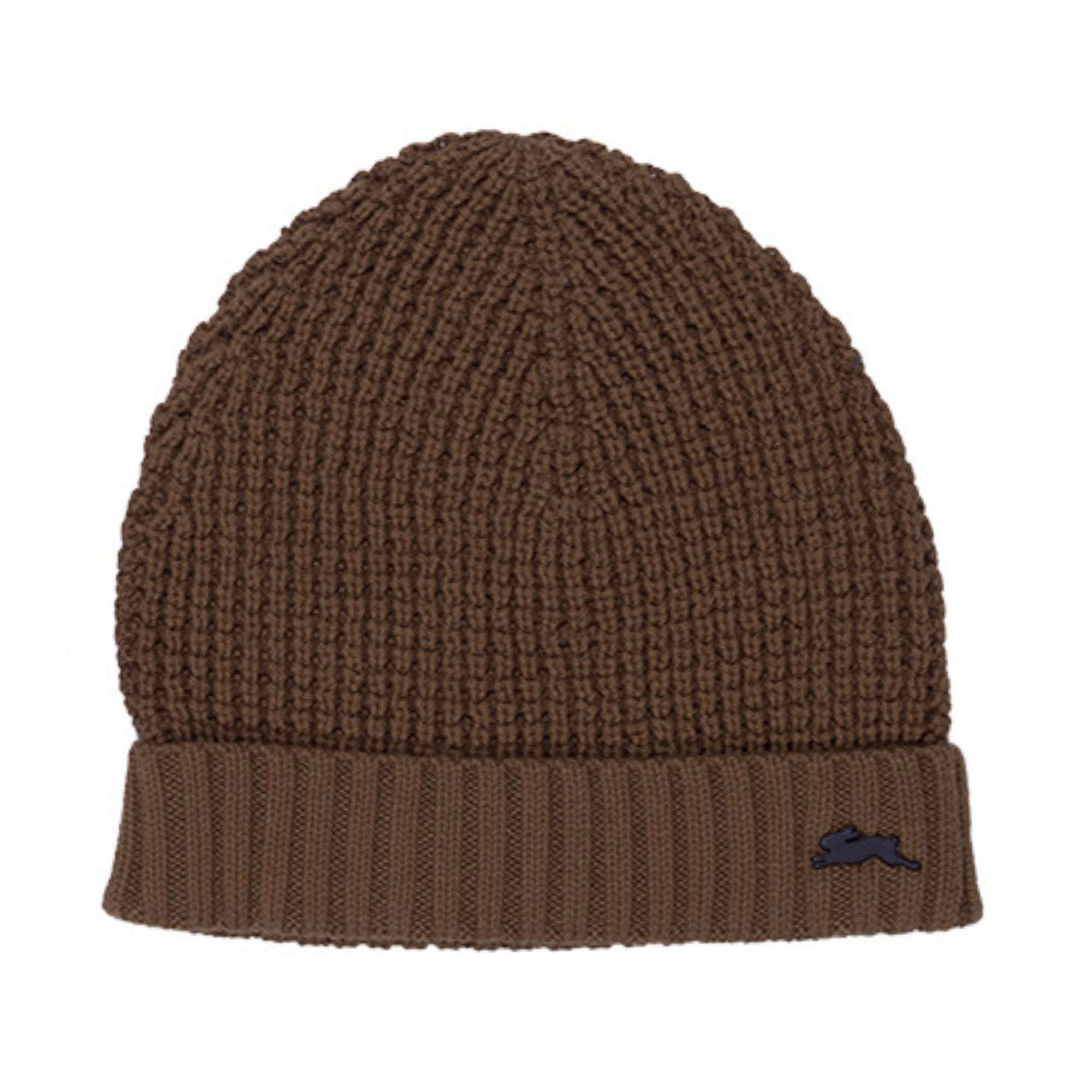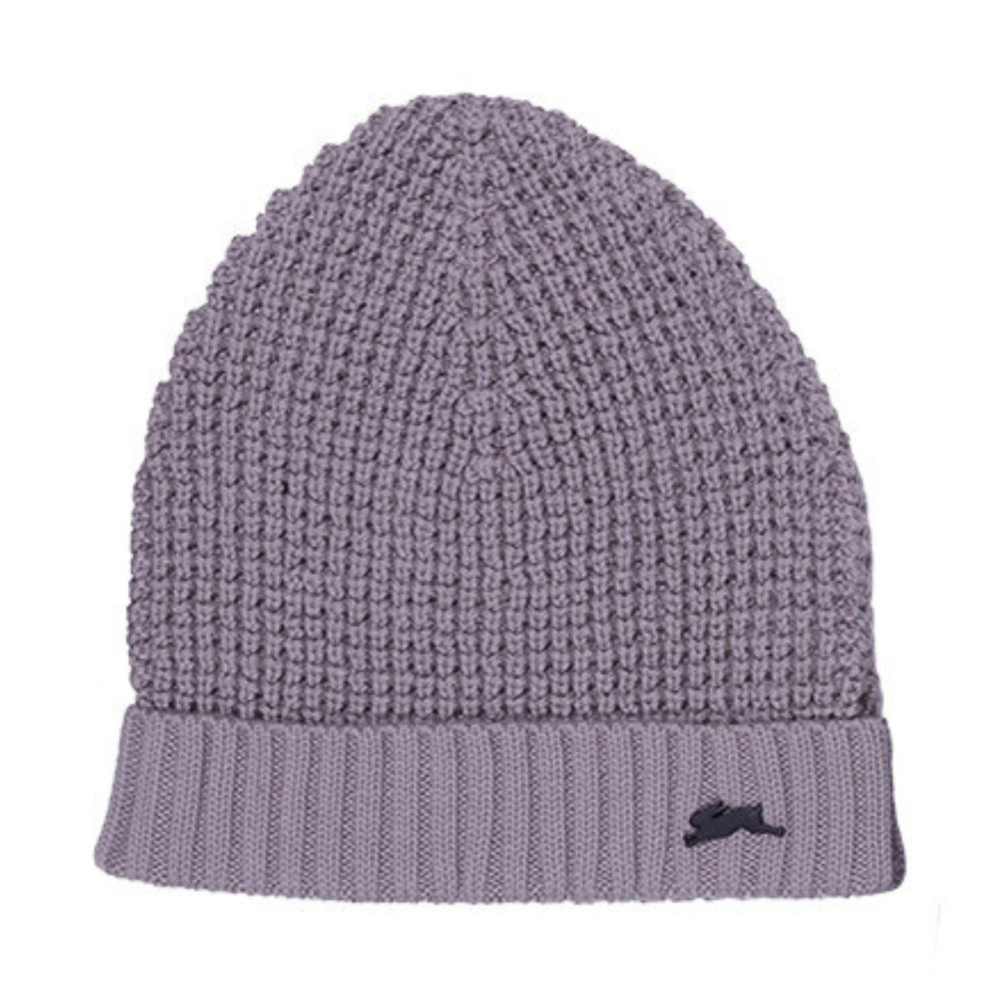 Popcorn sweater knit beanie with ribbing at the bottom edge of hat and our signature A.T rabbit pin placed at the front lower left edge of the ribbing.