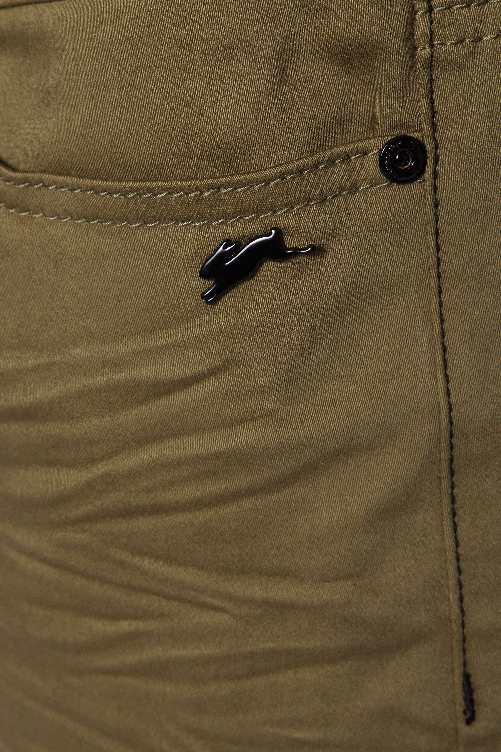 - Signature A.T rabbit pin placed below the front left pocket