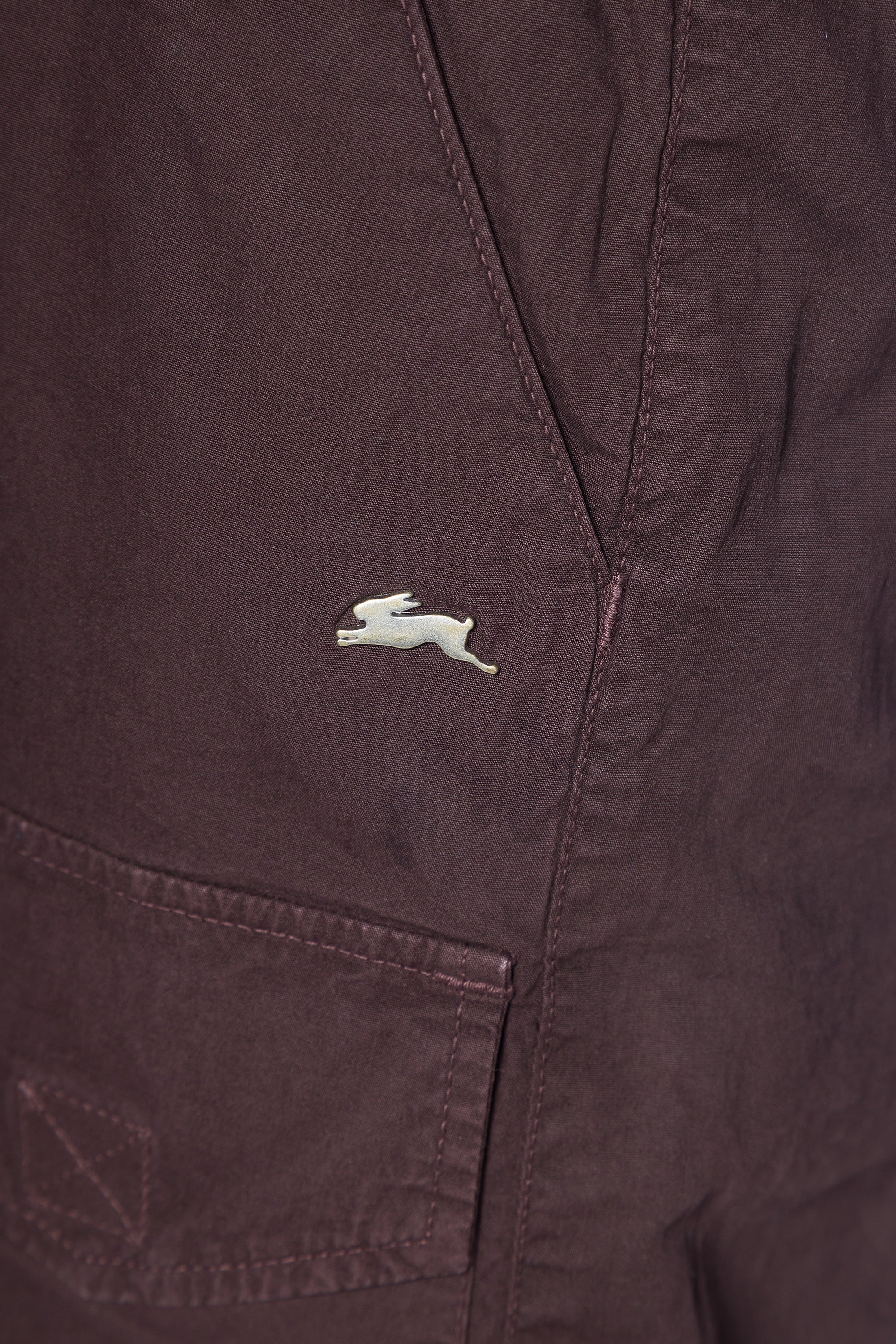 - Signature metal rabbit pin below left-hand pocket