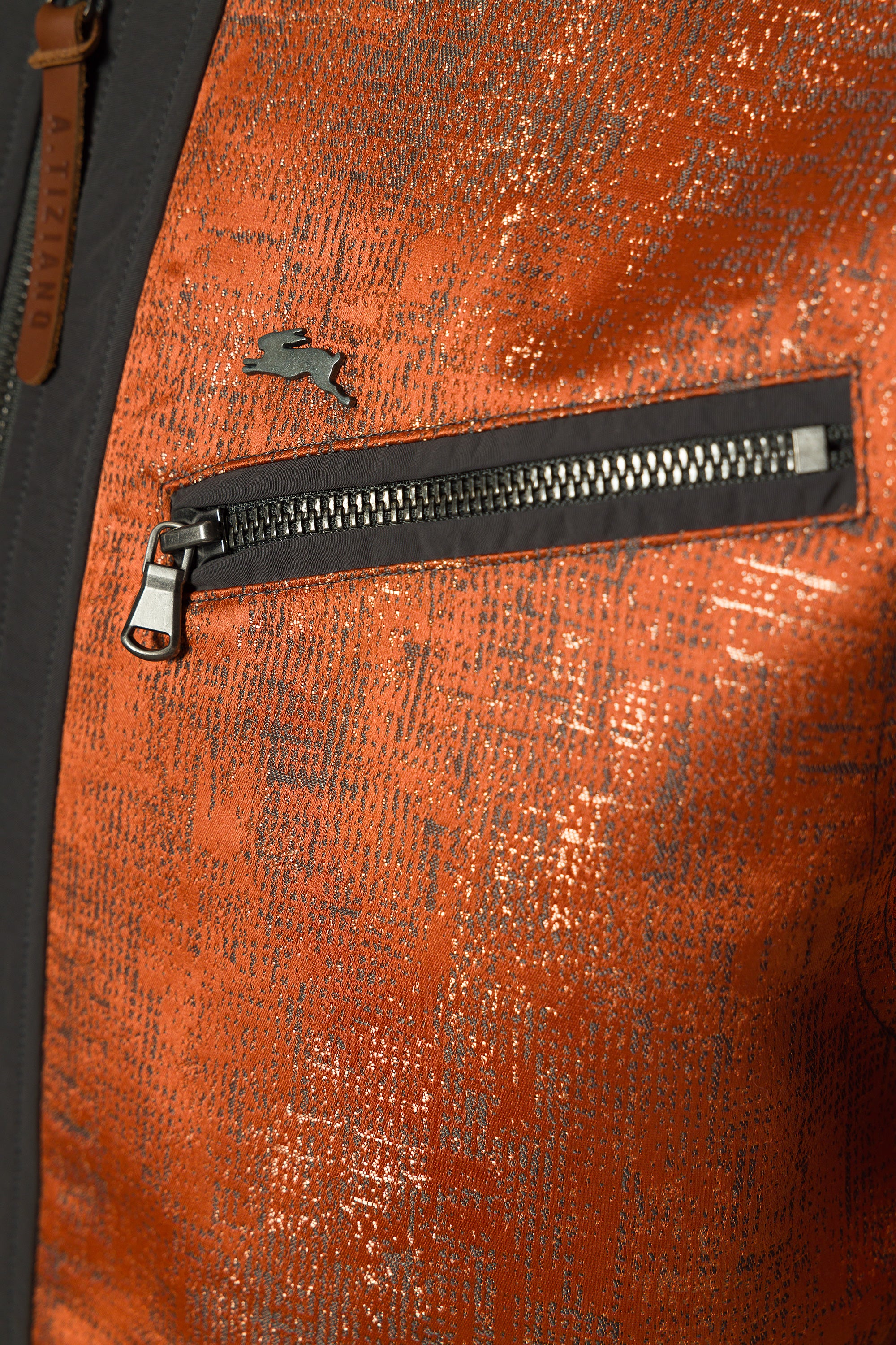 - Signature metal rabbit pin at left chest