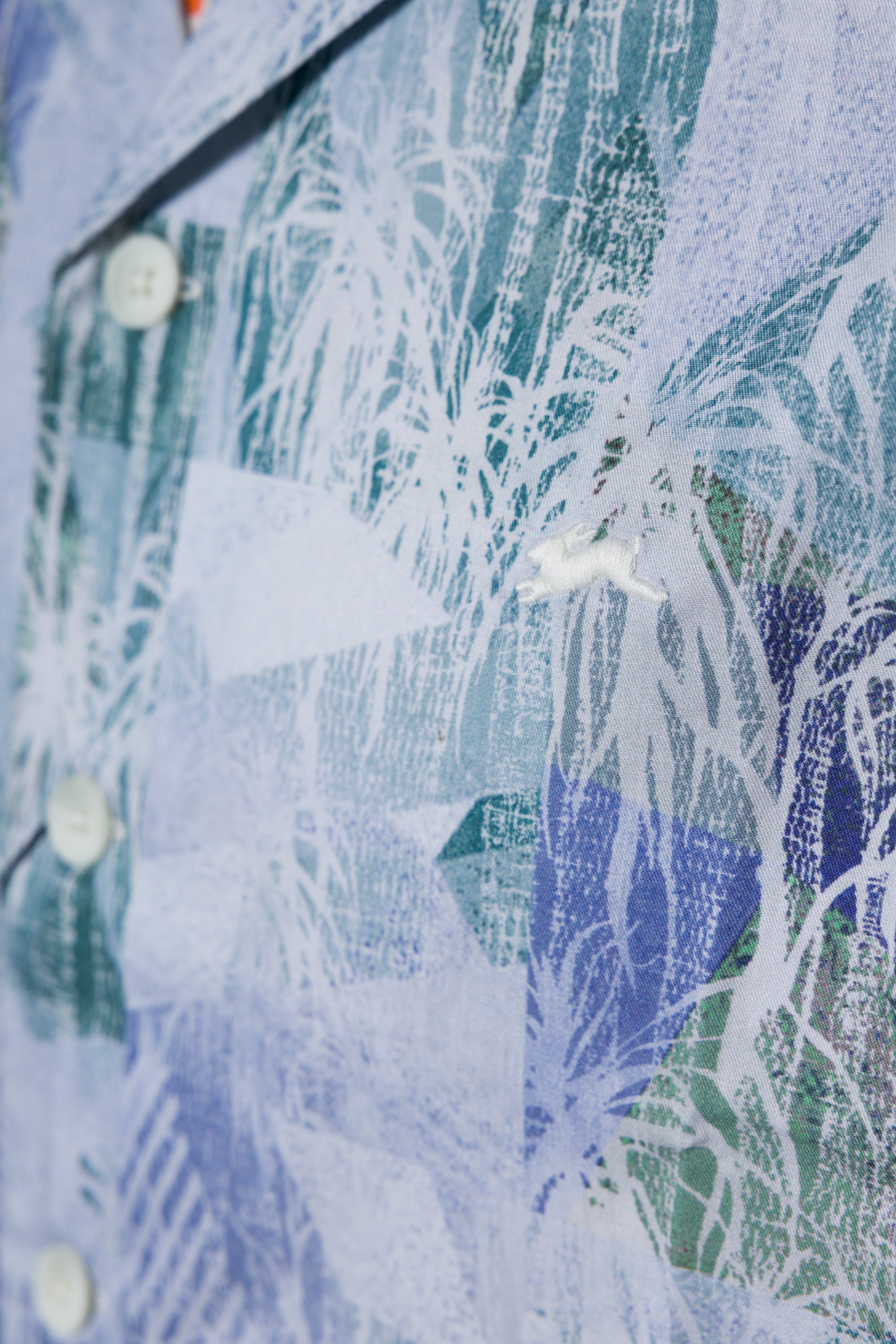 - Woven authenticity label at the lower left corner near the hem
