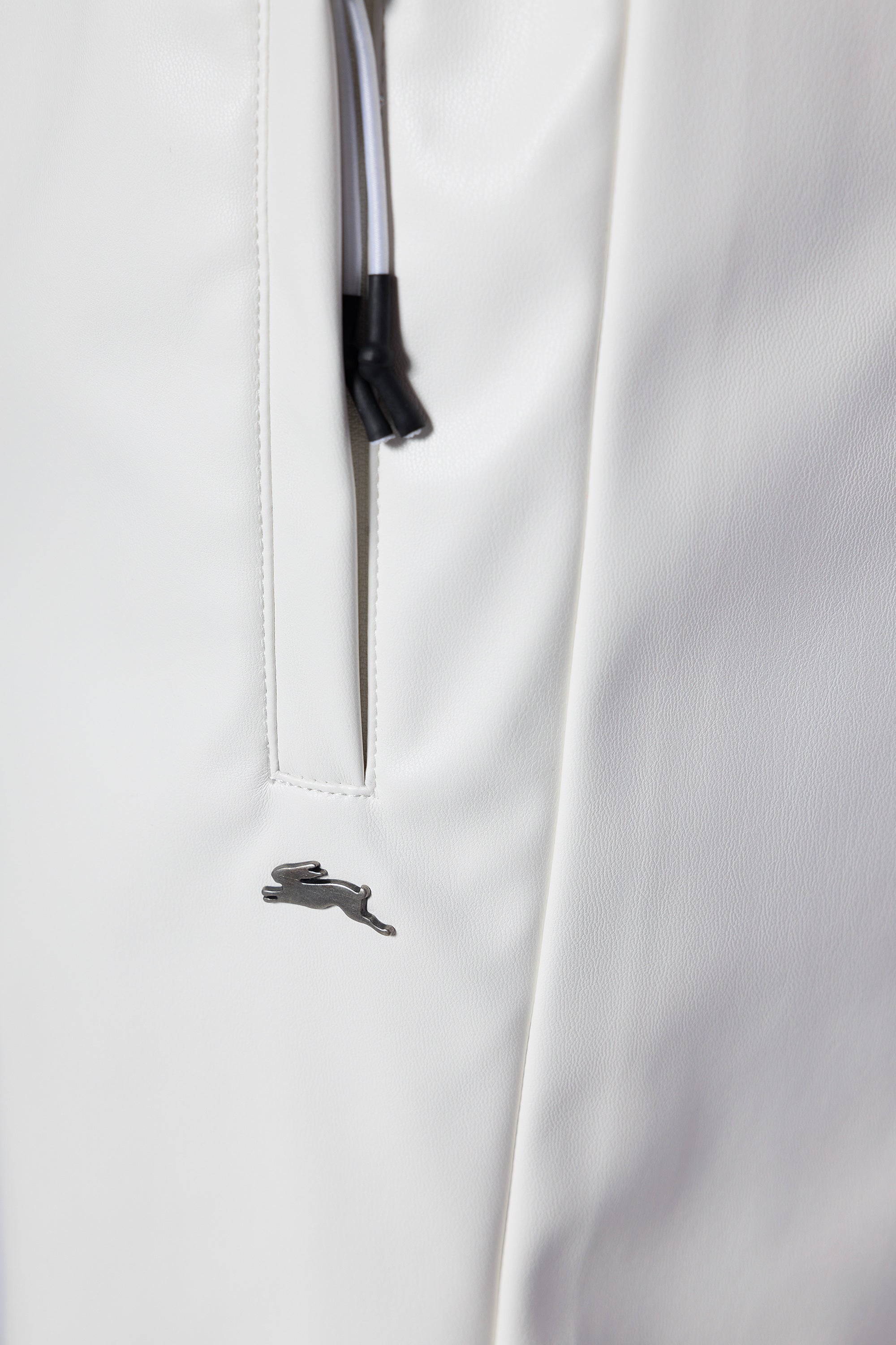 - Signature metal rabbit pin below left-hand pocket