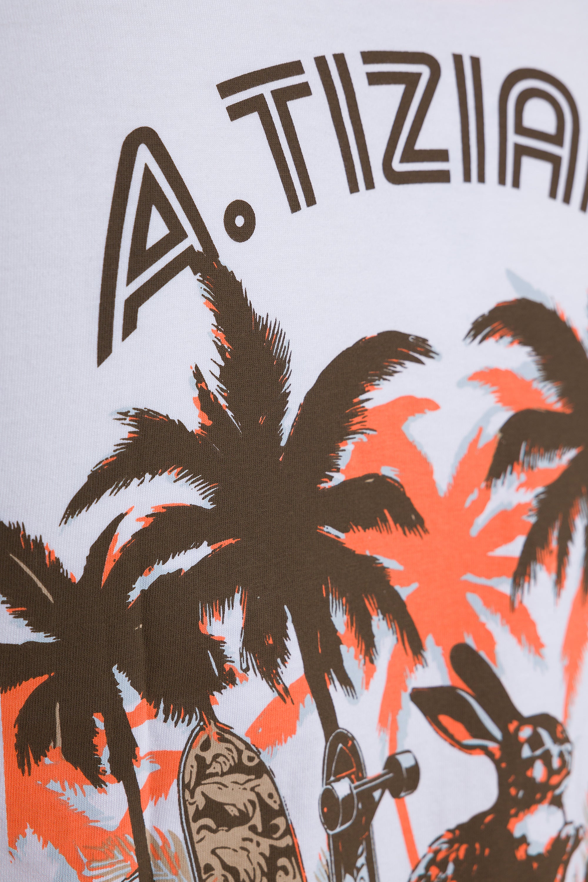 Enjoy the tropical summer vibes from this soft cotton tee featuring our signature rabbit with skateboards and palm trees!