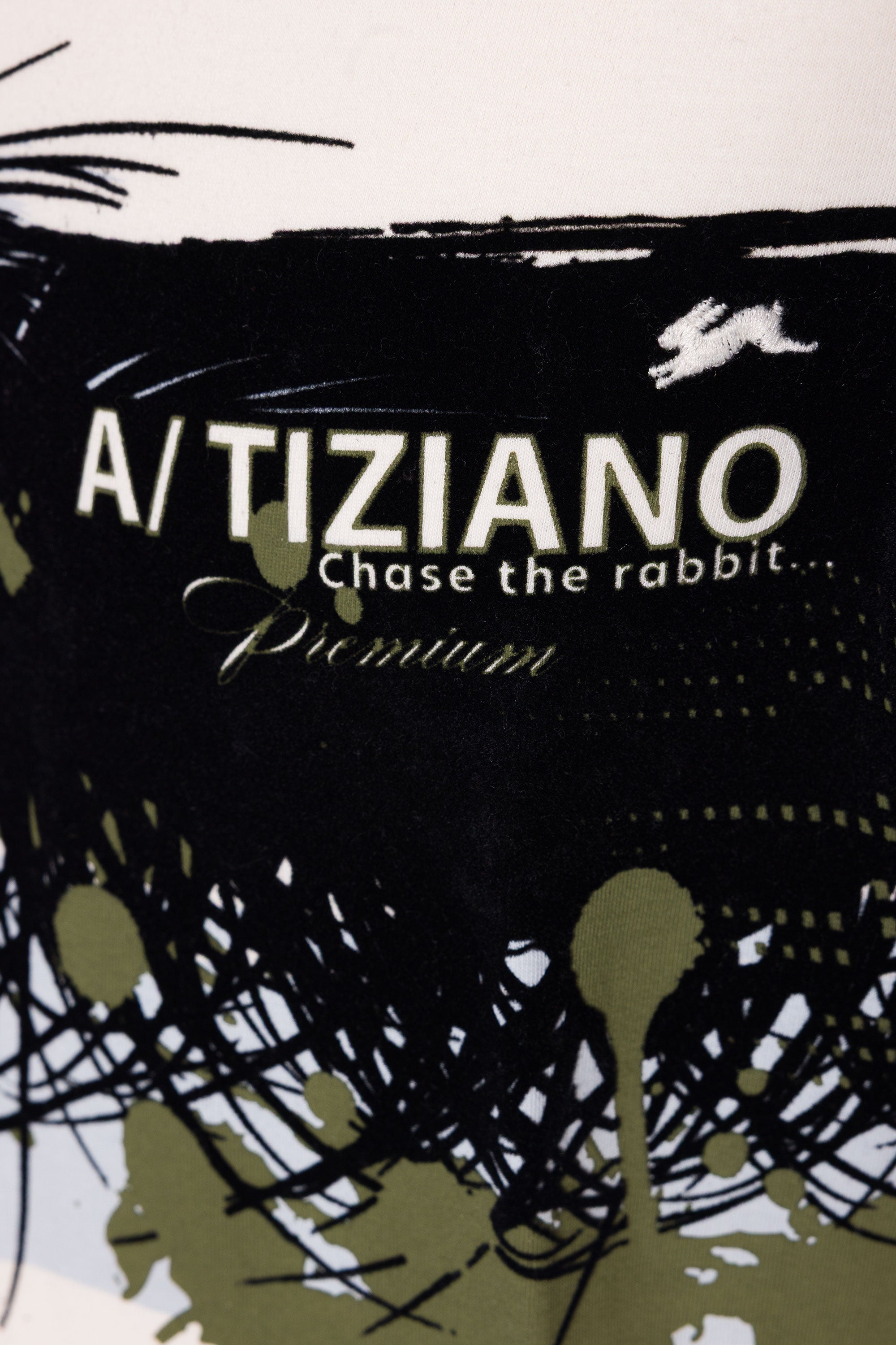 - Signature A.T. rabbit embroidery at left chest